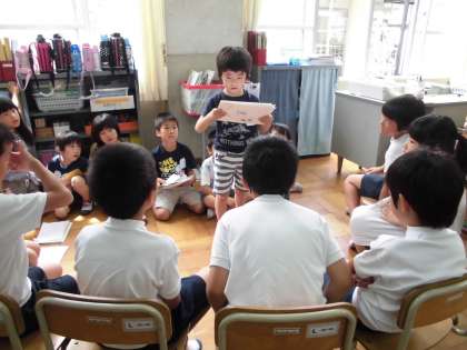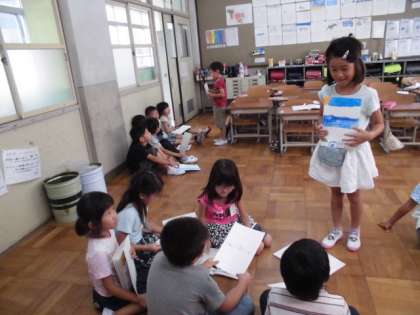 国語の時間に,夏休みにあった出来事について交流しました。頑張ったことやうれしかったこと,楽しかったことなど,たくさんのお話がありました。それぞれの思い出があって,みんな楽しそうに聞いていました。クラスで交流した後,2年生にも夏休みの思い出を話しました。たくさん質問や感想をしてもらい,1年生は喜んでいました。