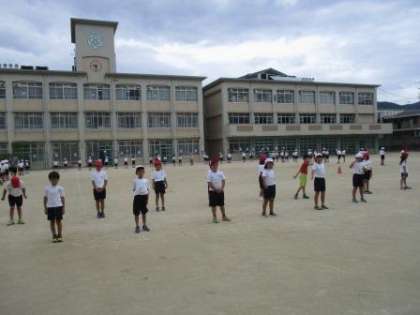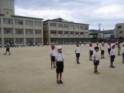 運動会に向けてダンスの練習をしました。今日は初めて運動場に出て隊形移動の練習を行いました。リズムに合わせながら,間奏の間に移動できるように頑張っています。