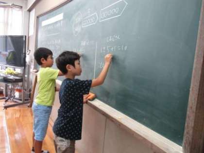 算数の学習で「ふえたりへったり」の学習をしています。問題文から読み取ったことを数図ブロックや図に表し,まとめて考える思考法を学習しています。まとめて考える良さを話し合いました。