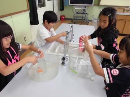 算数で「おおきさくらべ」の学習をしています。2つの容器を見て,どちらの方が水が多く入るのか比べました。実際に水を移し替えたり,ビーカーを使ったりして,かさを比べる活動をしました。これからも身近なもののかさを自分で比べてみてほしいです。