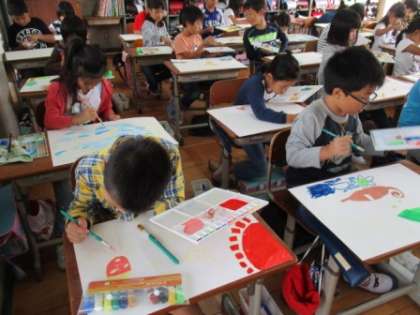 図工の時間に読み聞かせを聞いて,想像で絵を描いています。みんな,とてもていねいです。