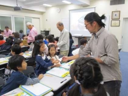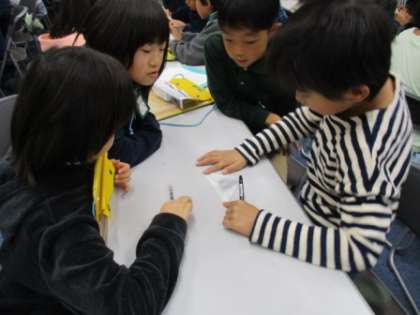 渡り鳥のようなチョウ「アサギマダラ」について,ゲストティーチャーの藤野先生に教えていただきました。アサギマダラは春,あたたかくなると北へ向かってとび,秋になると南へかえります。2000kmもの長い距離をとぶことができるチョウなのだそうです。みんなでアサギマダラにマーキングをして放してあげました。遠く,遠く,無事に飛んでいってほしいと思いました。