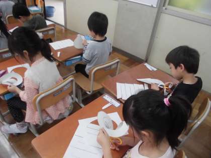 図工科「チョキチョキかざり」の学習です。まずは,はさみを人に渡すときのルールや正しい使い方を学び,折り紙を切ってかざりを作りました。折り方や切り方を変えるだけで全く違う模様になることを楽しんで学習しました。