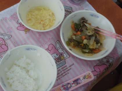 本日の給食に「やきにく」と「トマトとたまごのスープ」が出ました!野菜が苦手な子たちが多いですが頑張って食べてみると…「ピーマンおいしい!」「トマトが甘くておいしかった!」など,おいしいの声がたくさん!おかわりもたくさん!今日もおいしくいただきました。