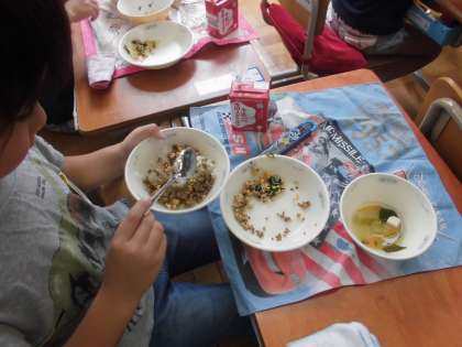 今日の給食は,人気メニューのビビンバです!ご飯にかけてもりもり食べました!たくさん食べて午後からの授業,頑張れたかな?