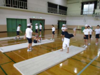 今日で5時間目のマット運動。ねらい1の組み合わせ・連続技も,ねらい2の頑張ればできそうな技に挑戦!も転回系の技が増えてきました。「倒立」は4年生全員ができるようになる!を目標にしています。