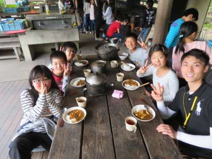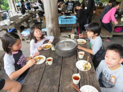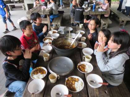 できあがったカレーライスを食べました。「おいしい〜」の声があちこちで聞こえました。