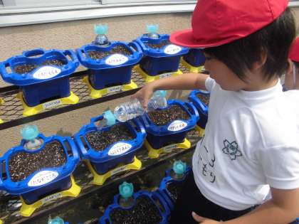 子どもたちは早く朝顔の芽が出てほしいようで,やさしく語りかけながら水やりをする姿が見られます。早く芽が出るといいね!