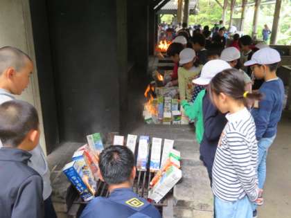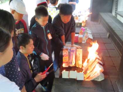 アルミホイルで包んだパンを,牛乳パックにいれて火を付けます。少し燃えすぎているようにもみえますが,うまくできるでしょうか・・・楽しみです。