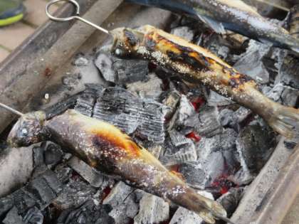 魚の内臓を手でかきだした後,魚を串にさして焼きます。炭火でいい感じに焼けてきましたよ。