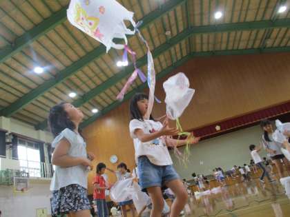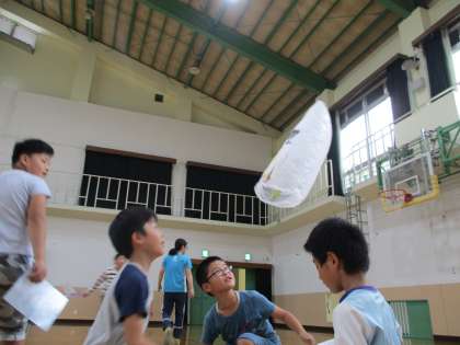 下から扇風機で風をおくり,ふくろがふわ〜と舞い上がっていくのを見て大興奮な子どもたち。汗びっしょりになって楽しみました。