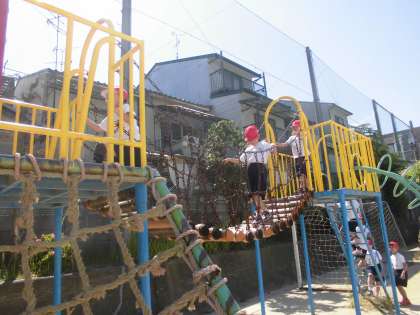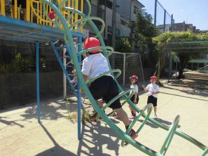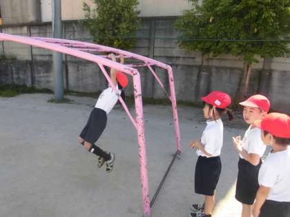 体育科「遊具で遊ぼう」の学習です。「前の人をおしたり,あわてさせない」などルールの確認をした後,ジャングルジムや雲梯をしました。