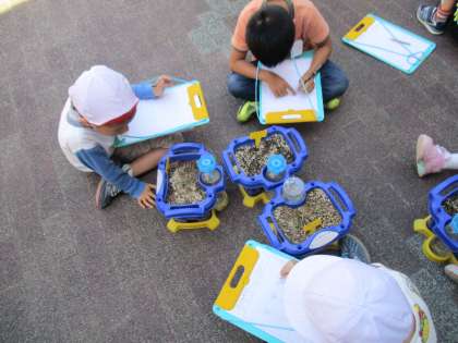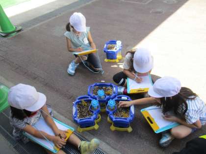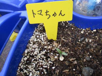 ミニトマトの芽が出てきました。「早く大きくなってね〜」「あまーいトマトになってね」と願いをプリントに書き込みました。みんな,自分のミニトマトに名前をつけて育てています。