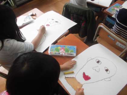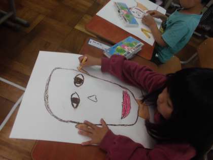 図工科「ぼくのかお わたしのかお」の学習です,鼻,目,口,輪郭など顔のパーツを一つ一つ丁寧にパスで描いていきます。少しずつですが,だんだん顔になってきました。土曜参観で各教室に掲示予定です。是非ご覧ください!