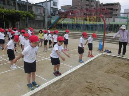 体育科では,体力テストの「幅跳び」をしました。タイミングよく大きく腕をふって跳びました。