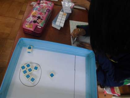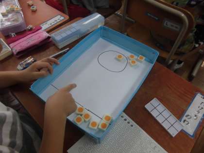 「10」はいくつといくつに分けられるかを考えました。おはじきをして入った数と入らなかった数を記録しながら学習しました。