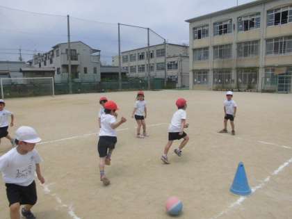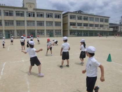 体育科「ころがしどっじ」です。転がす人は,足の位置や体勢に気を付けて,避ける人は,ボールから目を離さずに動く練習をしました。