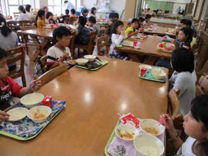 年に2回ある「ランチルームでの給食タイム!」みなルンルンしながら,ランチルームに行きました。明るくて雰囲気が良いランチルームでの給食は,とてもおいしかったようです。