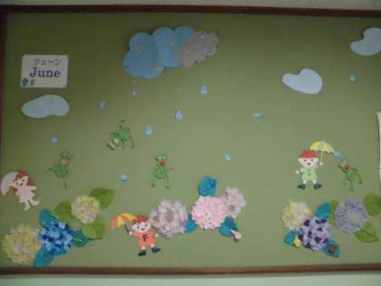 もう梅雨ですね!学校の掲示板も・・・かえるさんが喜んでいます!