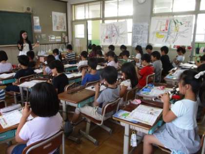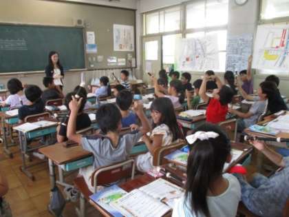 音楽の時間にリコーダーの練習をしています。今日は高い「レ」の音がうまくふけて,先生にほめられました。みんな大喜び。