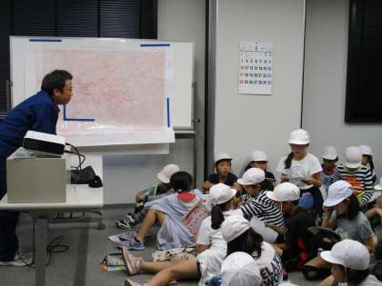 午後からは,エコランド音羽の杜へ。2つのグループに分かれて見学しました。Aグループは資料室で説明と質疑応答から。Bグループは山の5キロ先にある埋立地見学。巨大なダムと埋立地に度肝を抜かれた子どもたちでした。