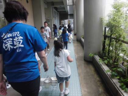 重たい食器ですが,二人一組でしっかり持って運びます。