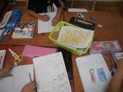 生活科では学校探検で行ったところにあったものを絵や言葉で書いて,班でまとめていきます。