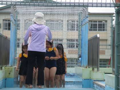 今日から体育科「水遊び」が始まりました。身のまわりのことやプールサイドでのルールなどをしっかり確認しました。