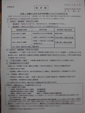 4月にお配りした「台風・地震に対する非常措置についてのお知らせ」を再度ご確認ください。また,リビング等の目につく場所に掲示するなどして,災害時に安全に対応できるように各ご家庭でも非常時における集合場所等も含めてご確認ください。自然災害の大きさによっては,携帯・スマホ・メール配信等が使用できない場合も想定されます。常日頃から,学校・地域・家庭において,防災意識を高めていきたいと思います。宜しくお願いします。(ホームページ右側にも「配布文書」の欄に載せてあります。)