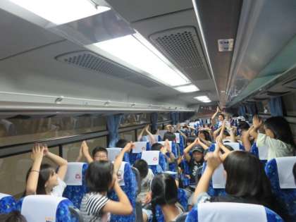 広島方面へ向けて,バスは順調に高速道路を走っています。バスの中では,バスレクを楽しんでいます。