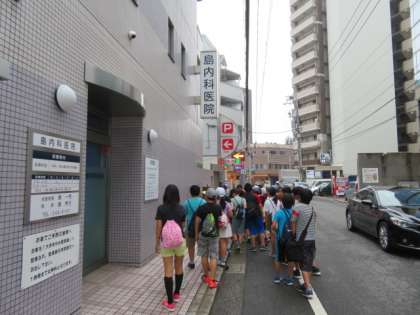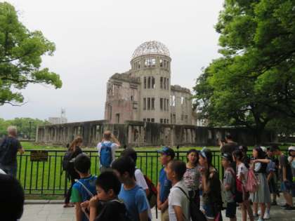 予定通り原爆ドーム前に到着しました。記念写真を撮って爆心地を通って原爆の子の像で折り鶴集会をしました。