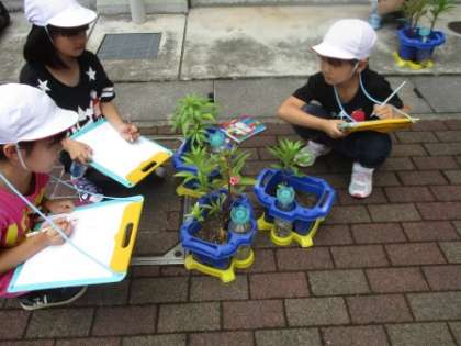 理科の時間にホウセンカの観察をしています。ずいぶん大きくなってきて,花も咲き始めました。