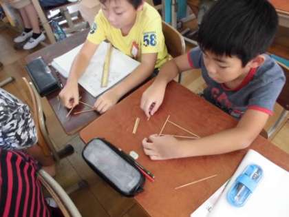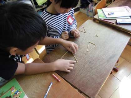 算数は「三角形」の学習に入りました。今日はひごを使って,いろいろな三角形を作りました。三角形には,辺の長さがみんな違う三角形,二等辺三角形,正三角形があることを知りました。次回からは作図です。