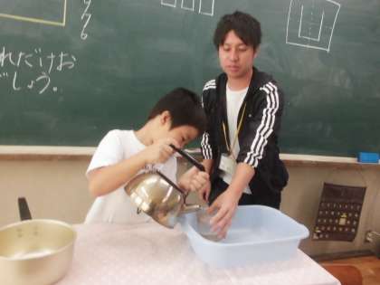 算数科「大きさくらべ」では,前回のくらべ方とは違い,一つのコップを使い,やかんやおなべの中に入っている水がコップ何杯分になるかを調べ,