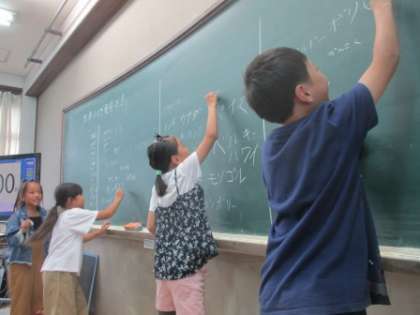 総合的な学習の時間に国際理解について学習しています。今日は,知っている国をどんどん黒板に書いていくゲームをしました。盛り上がりました。