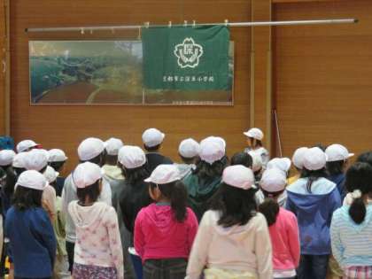 雨のため,プレイホールでの入所式となりました。校歌を歌い,旗あげをした後,みさきの家の職員の方の話を聞きます。