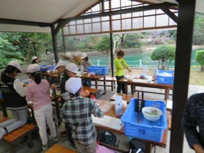 1日目の最初の大きな活動は「野外炊事」です。メニューは「すきやき風煮」です。みんなで協力して,野菜を洗ったり材料を切ったりしていきます。