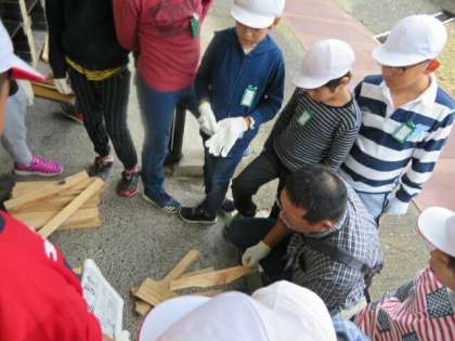 先生からまきの組み方を教えてもらっています。常に空気が入るようにたて向きのまきと横向きのまきを交互にするのがコツです。上手に組めるかな。