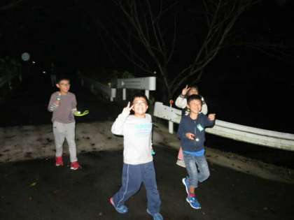 1日目の夜,子どもたちはナイトウォークを楽しみました。空を見上げるととてもきれいな星空が広がっています。先生から星の話もしてもらいました。