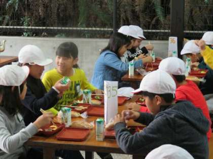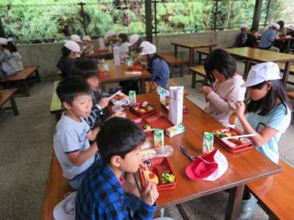 野外炊事場で朝食です。4年生のみなさん,しっかり食べて,今日も元気に活動しましょう。