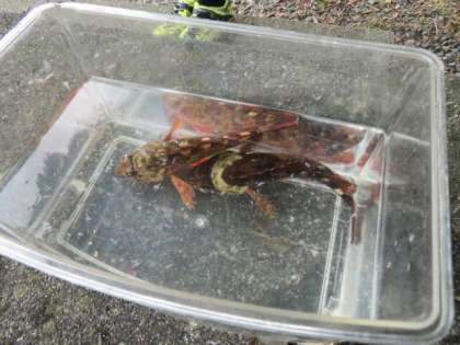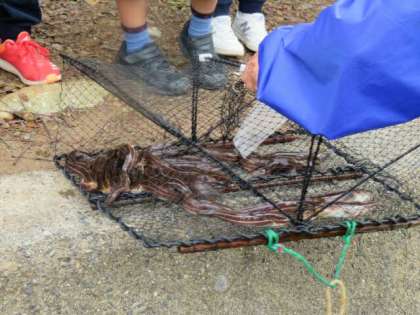 深谷水道でかご漁です。昨日から仕掛けて頂いていたかごをグループで引き上げました。一番大漁だったのはゴンズイでした。