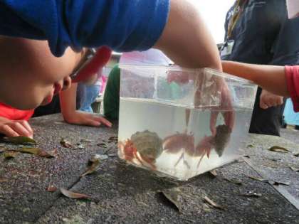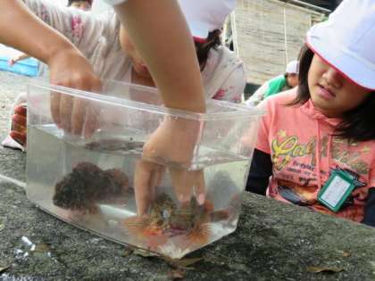 とれた生き物を水槽に入れて,観察しました。カサゴ,オオヤドカリ,フグなど,結構とれたので良かったです。ゴンズイは危ないので見るだけですが,いろいろ触って楽しみました。