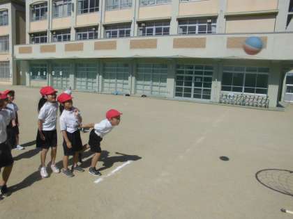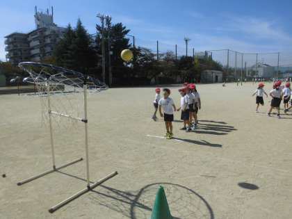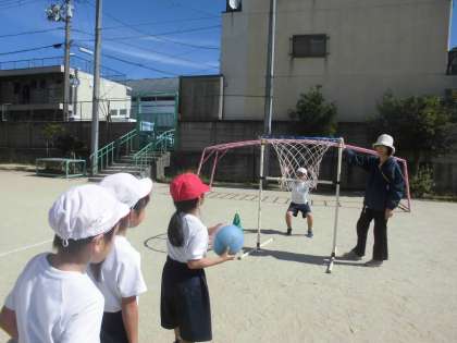体育科「パスゲーム」が始まりました。今日はシュートの練習やルールの確認をしました。