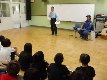 地域の消防団の方に来ていただき,「消防団について」お話を聞きました。初めて知ることがたくさんあって,教科書では学ぶことができないことをたくさん学べた1時間でした。ありがとうございました。