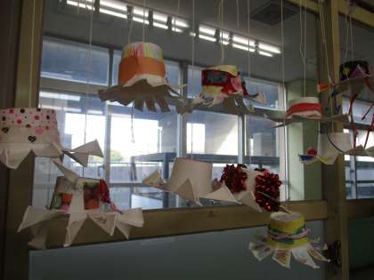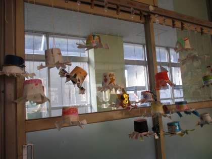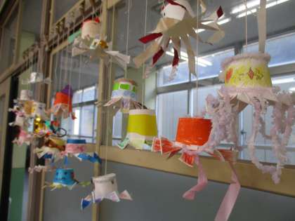 図工で「くるくるまわれ」の学習をしました。紙コップを使って飾りを作りました。風に吹かれて,くるくるとまわってきれいです。
