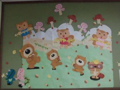 掲示板にはどんぐりやイチョウの葉っぱを拾ってうれしそうな顔をしている動物たちがいます。秋ですねぇ〜。