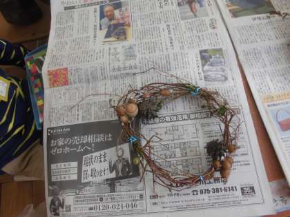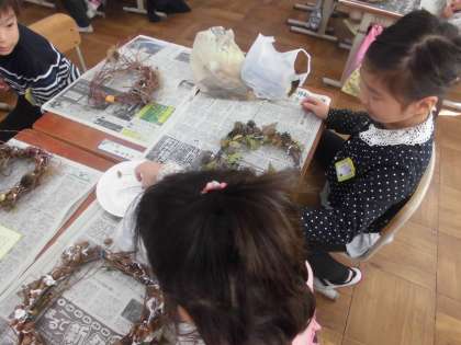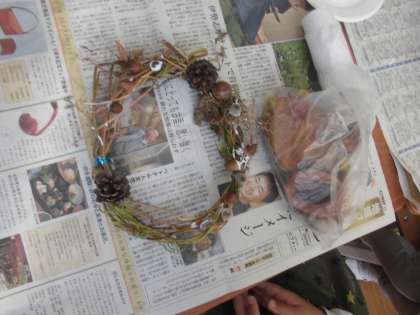大切に育ててきた朝顔のつると,秋見つけで拾ってきたどんぐりやまつぼっくりを使ってリース作りをしました。