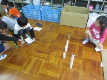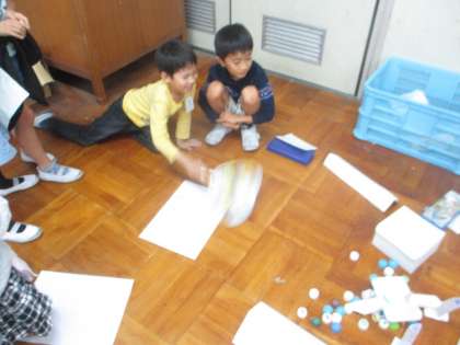 生活科「あそんで ためして くふうして」でおもちゃを作り,遊びを考えて交流会をしました。みんなたくさん工夫しており,盛り上がっていました。