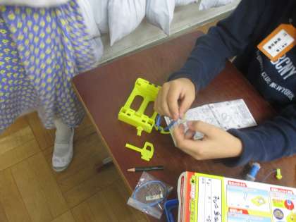 電磁石の学習をしています。キットを使って電磁石を作成しました。電気を通すと磁石になるということに感心していました。