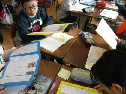 自分が作ったリーフレットを,友達に読んでもらいました。読んでもらう時の視点を3つ話してから,読む人はその視点を意識して読みました。読む人に分かりやすい文章が書けていたかな?